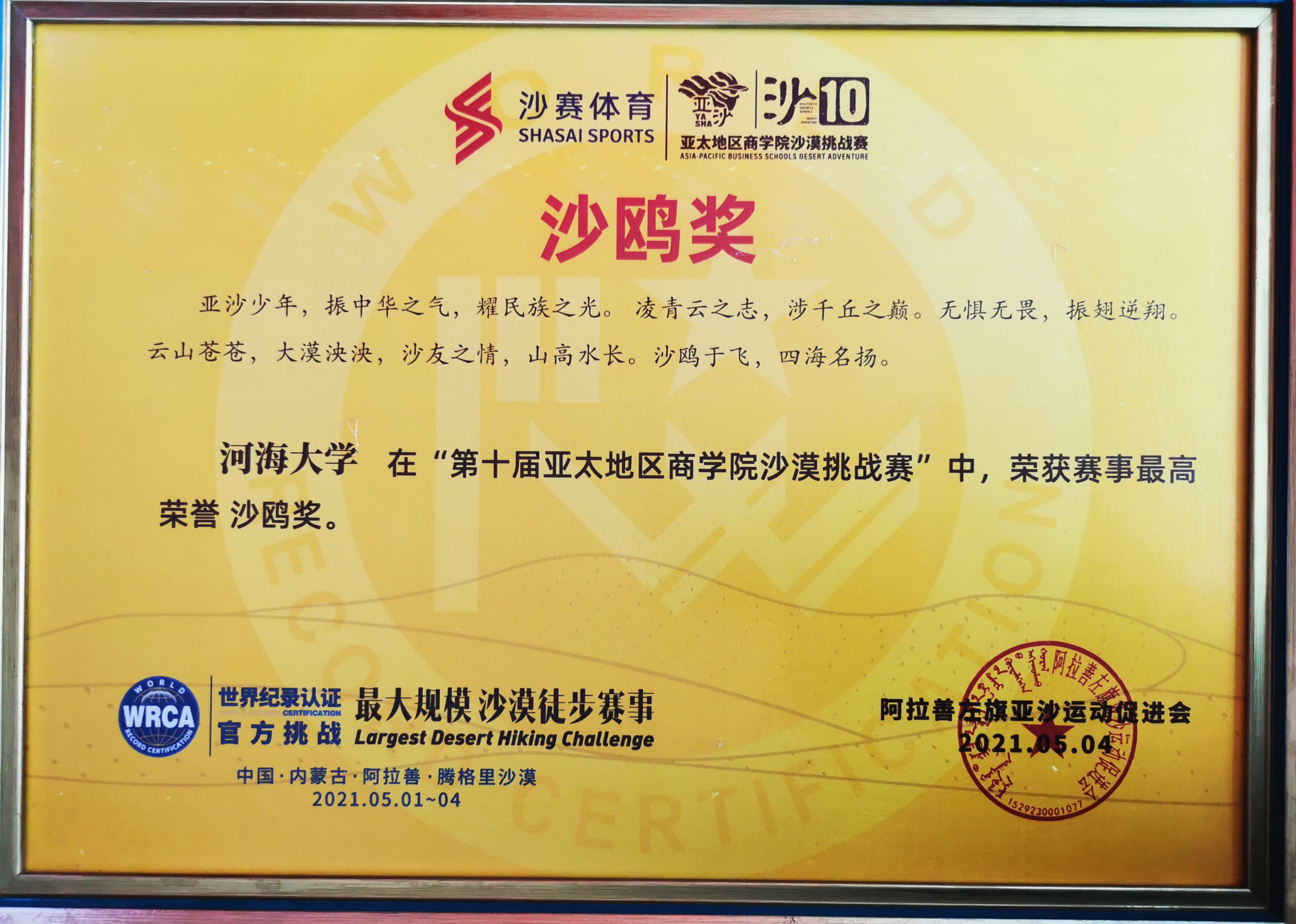 2021年5月2日至4日,第十届亚太地区a片免费看 沙漠挑战赛在内蒙古阿拉善盟左旗腾格里沙漠举行。来自亚太地区121所院校,4000余人共同参赛,在亚沙十年之际创下历届亚沙赛规模之最。由a片免费看 a片免费看 组建的“沙10战队”获MBA组团体第五名,并摘得大赛最高荣誉“金沙鸥奖”。同时,个人组获女子超A队第六名、男子A队第九名、女子C队第九名好成绩。