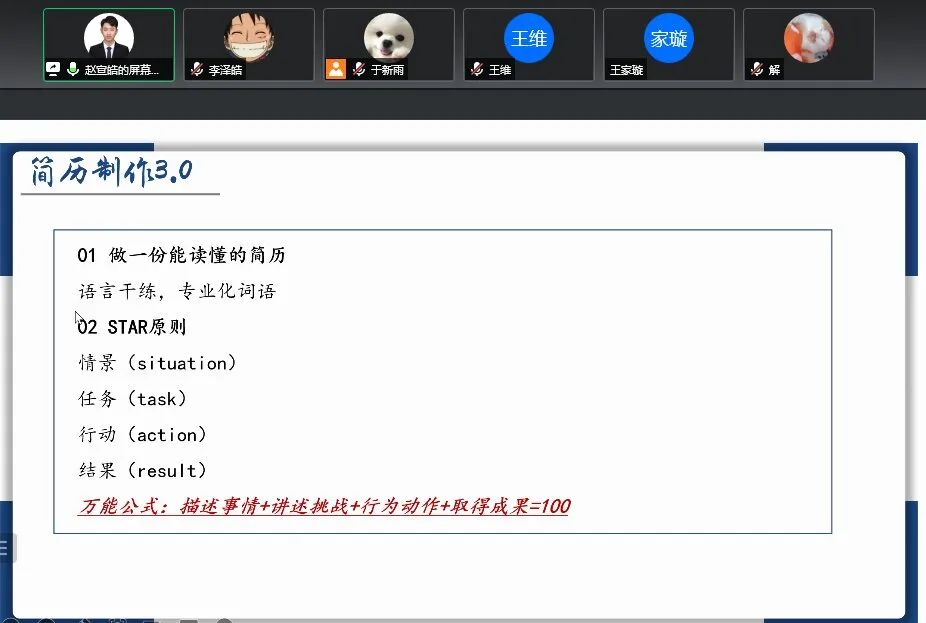 简历如同个人名片,一份优秀的简历往往是取得成功的重要条件。赵宣皓同学分享了关于简历制作的知识与经验,就简历制作问题给予了很多解答,其中穿插技巧与注意事项,可谓干货满满。讲解过程中,赵宣皓同学借助自身经历强调简历制作过程中注意事项的重要性,让同学们更好地意识到问题的重要性。佘月同学结合自身求职经历给同学们分享了一些实习信息的搜集渠道和实习面试的注意事项,为同学们指明了行动的方向。