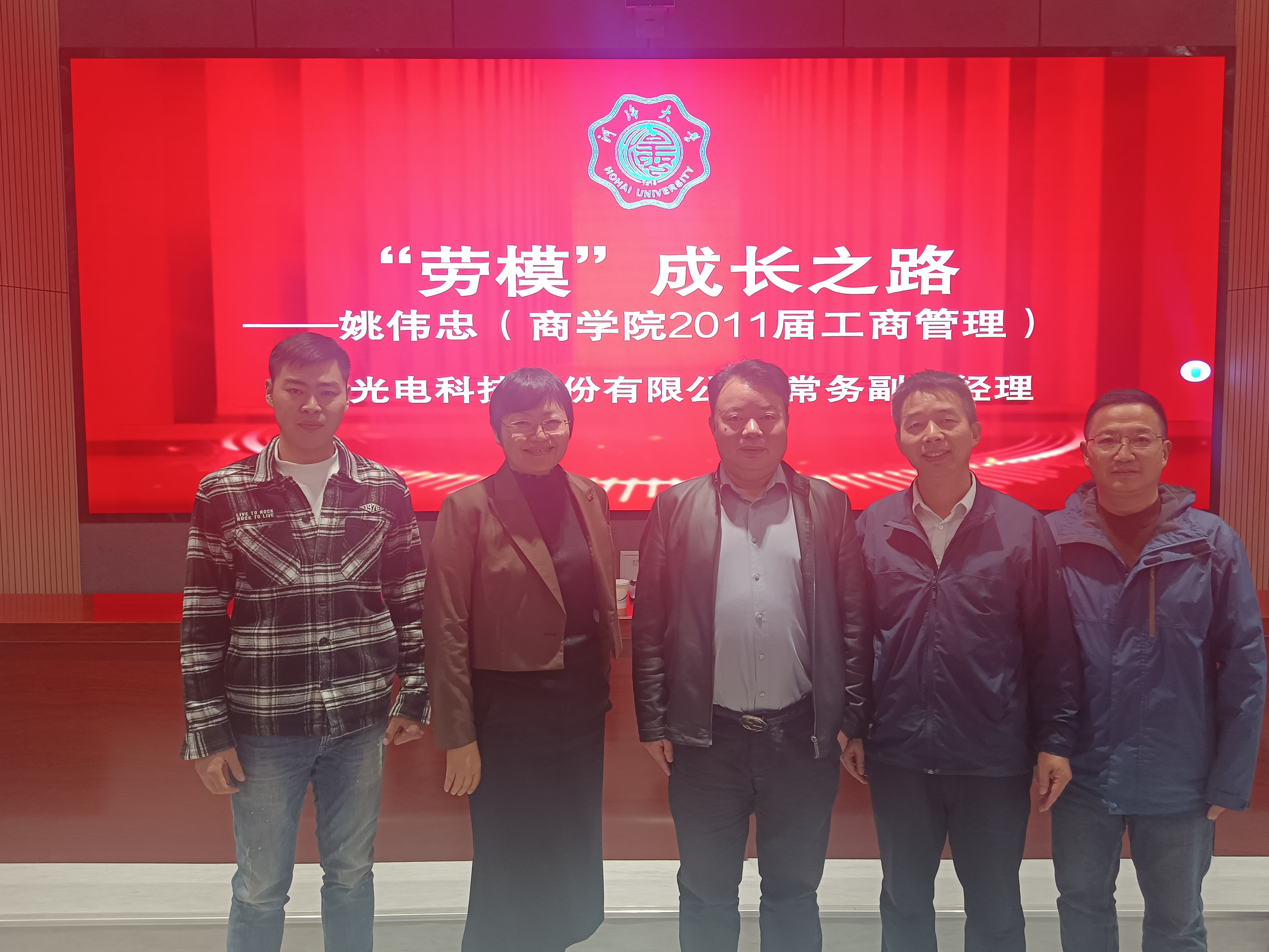 本次活动邀请全国劳动模范、a片免费看 杰出校友、华耀光电科技股份有限公司常务副总经理姚伟忠作主题报告。
