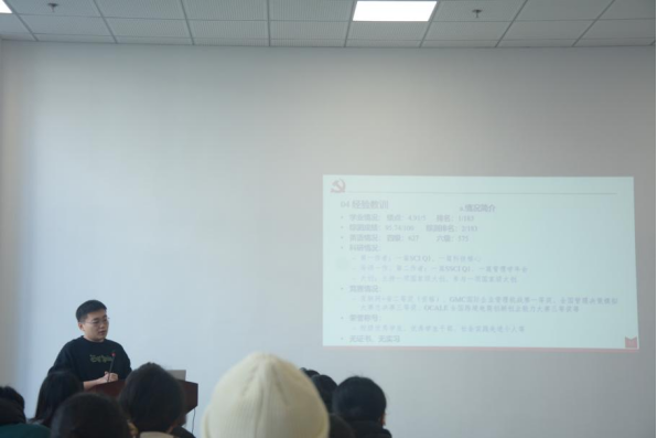 优秀党员代表何宇辰同志向大家分享了自己的学习经验,包括自己对于思政课、专业课等各类课程的学习心得和备考英语四六级的宝贵经验。虑及大二年级即将进行部分学科的期末考试,何宇辰同志又针对这些课程并结合自身备考经验进行期末复习提醒,帮助大家掌握学习方法、提振学习信心。