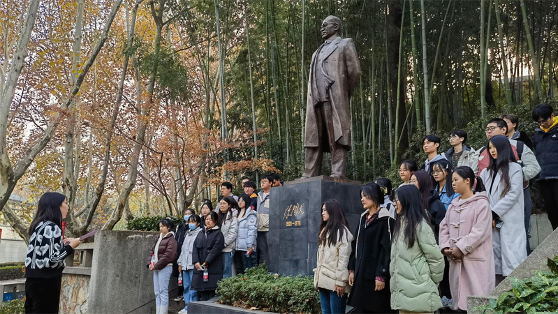张闻天铜像前,陆睿涵同学给同学们带来了一堂沉浸式实地团课,将张闻天在河海开启光辉革命生涯的奋进故事娓娓道来。面对铜像,同学们诉说着对张闻天先生的景仰和奋进新征程的热血。信仰的力量跨越时空召唤年轻的我们,凝聚集体星火传承闻天精神,唱响青春之歌争做时代新人。