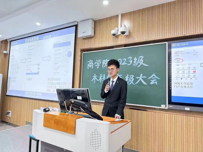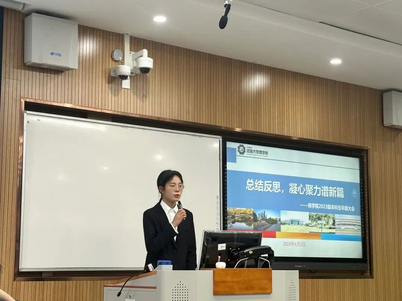 随后生活委员兼心理委员夏歆迪和张子航同学分别于一、二会场上台讲解日常事务管理,包括宿舍管理、反诈宣传和心理咨询的途径。为保障同学们在校拥有一个舒适的生活环境,生活委员按时对宿舍进行检查,减少安全隐患,在会上公布宿舍评分排名,同时向同学们进行了防诈骗宣传。