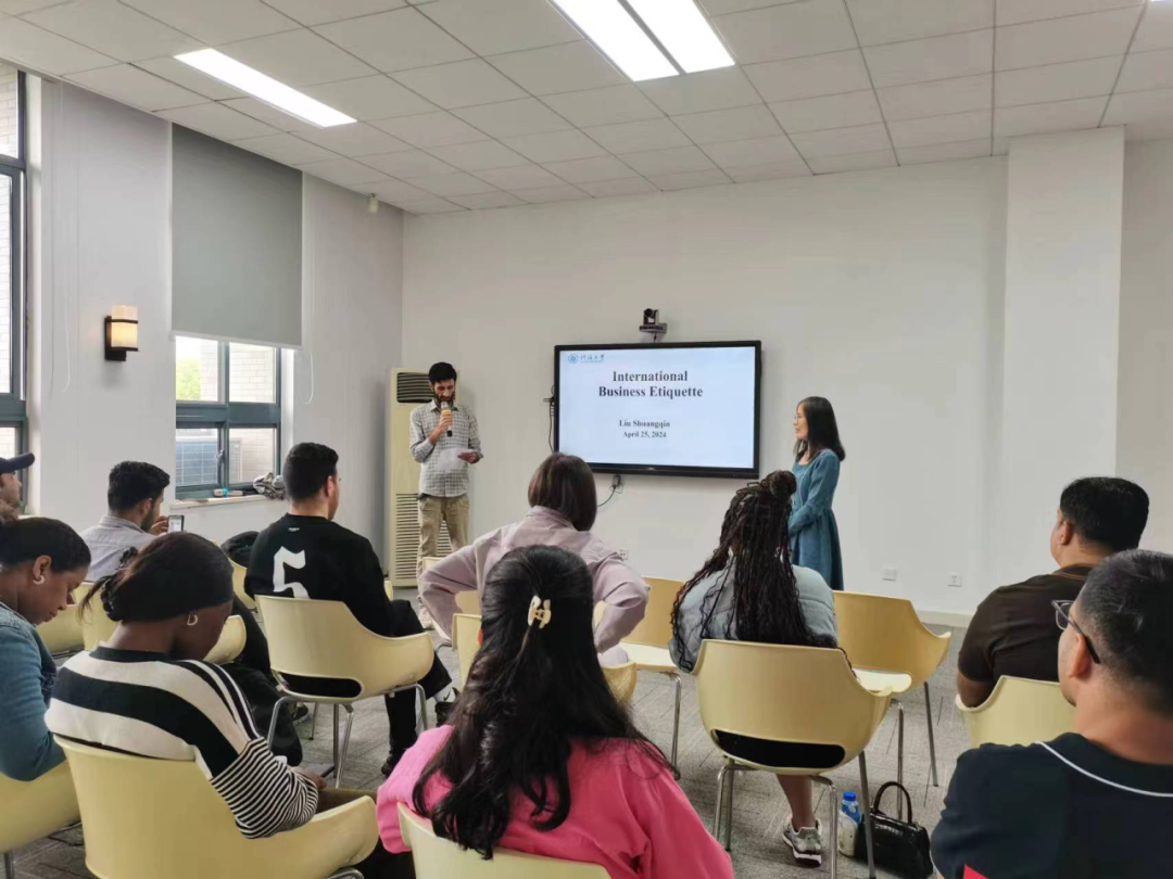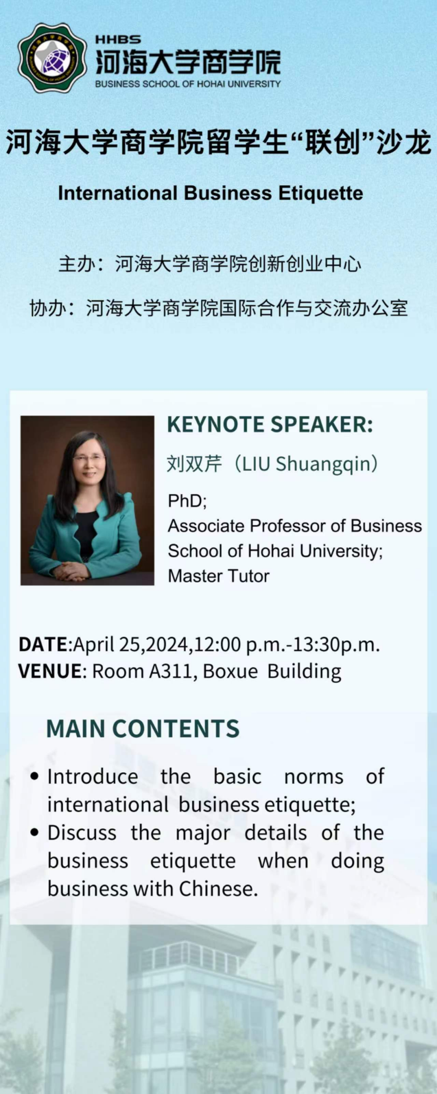 古人云:“人无礼则不立”。为了深化a片免费看 留学生的商务礼仪认知,提升商业素养,2024年4月25日,a片免费看 创新创业中心开展了a片免费看 留学生"联创"沙龙2024年第一期。本次沙龙特别邀请a片免费看 副教授、硕士生导师刘双芹老师作为主讲嘉宾,为同学们分享商业礼仪知识。a片免费看 70余名留学生报名参加。