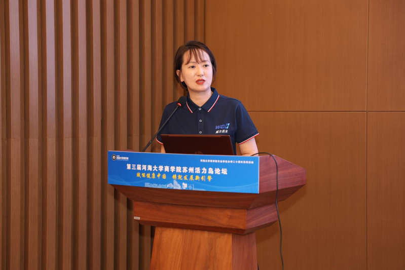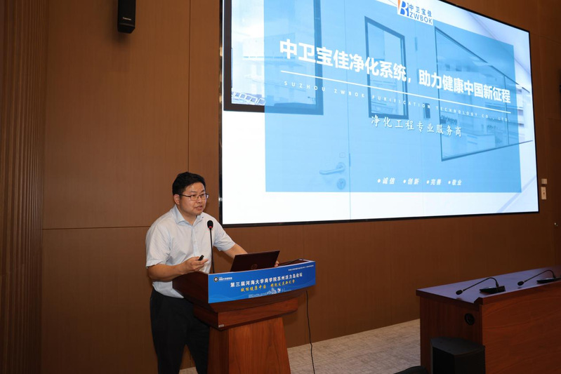 主题发言阶段由MEM教育中心学术主任薛松主持。苏州中卫宝佳净化科技有限公司总经理张华、南京威尔药业集团研究院副院长王娅、学院副院长张可分别就中卫宝佳净化系统对健康中国的贡献、威尔药业的绿色材料研发进展及学院在人才培养上的创新进行了介绍与分享。