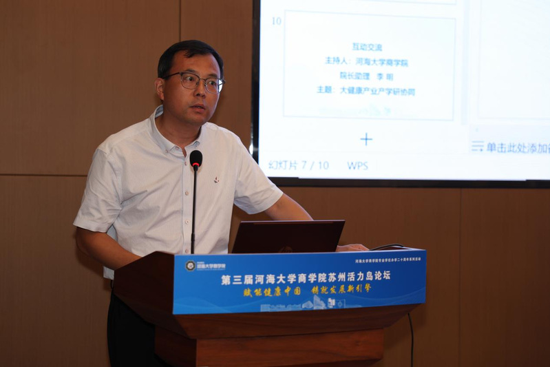 主旨发言环节由MBA教育中心学术主任李卉主持。中科健康产业集团总裁冯鹏、江苏苏豪健康产业有限公司董事长王涛、常熟市琴川医疗健康投资管理有限公司董事长、总经理殷峰、江苏省社科院泰州分院经济所副所长、副研究员李占国四位嘉宾分别就科技创新在大健康产业的作用、康养小镇建设、县域养老服务前景及江苏大健康战略实践进行了深入分享与探讨。