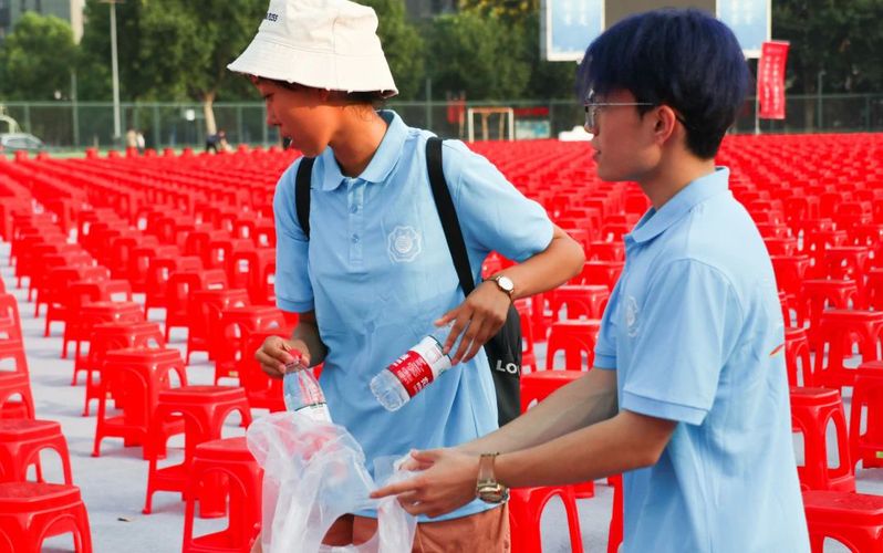 尽心尽力,团结奋进。下午16点,新同学们在顺利完成报到注册工作后,来到东操场与自己班级的助学导师集合,为开学典礼现场搬运矿泉水并给各座位分配矿泉水。虽然烈日炎炎,在学校各部门老师的指导下,从志愿者集合到分配工作,同学们秩序井然,认真听从负责老师安排,很快就投入到劳动之中,尽管大家第一次见面,但相互配合默契,团结协作。不论男生女生,大家活力十足,取水、搬水、摆水的工作有条不紊,不出一个小时大家就顺利完成了开学典礼现场矿泉水分配与家长席座位布置工作。在劳动中,新生们不仅体验到了团队合作的力量,更深刻理解了劳动最光荣、奋斗最幸福的深刻内涵。汗水浸湿了衣背,但他们的脸上却洋溢着满足与自豪的笑容。