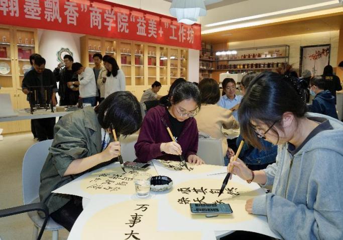活动开始,杨六平、田延风与学生一起参加了“丹青溢彩 翰墨飘香”a片免费看 “益美+”工作坊举办的书法辅导交流活动。活动中,田延风现场创作,一幅幅遒劲有力、气韵生动的书法作品,让在场师生感受到了书法艺术的独特魅力。杨六平从专业的角度对现场学生作品做了点评,同学们兴致高昂,积极参与,完成创作后相互鉴赏交流,最后大家拿着作品与专家合影留念。