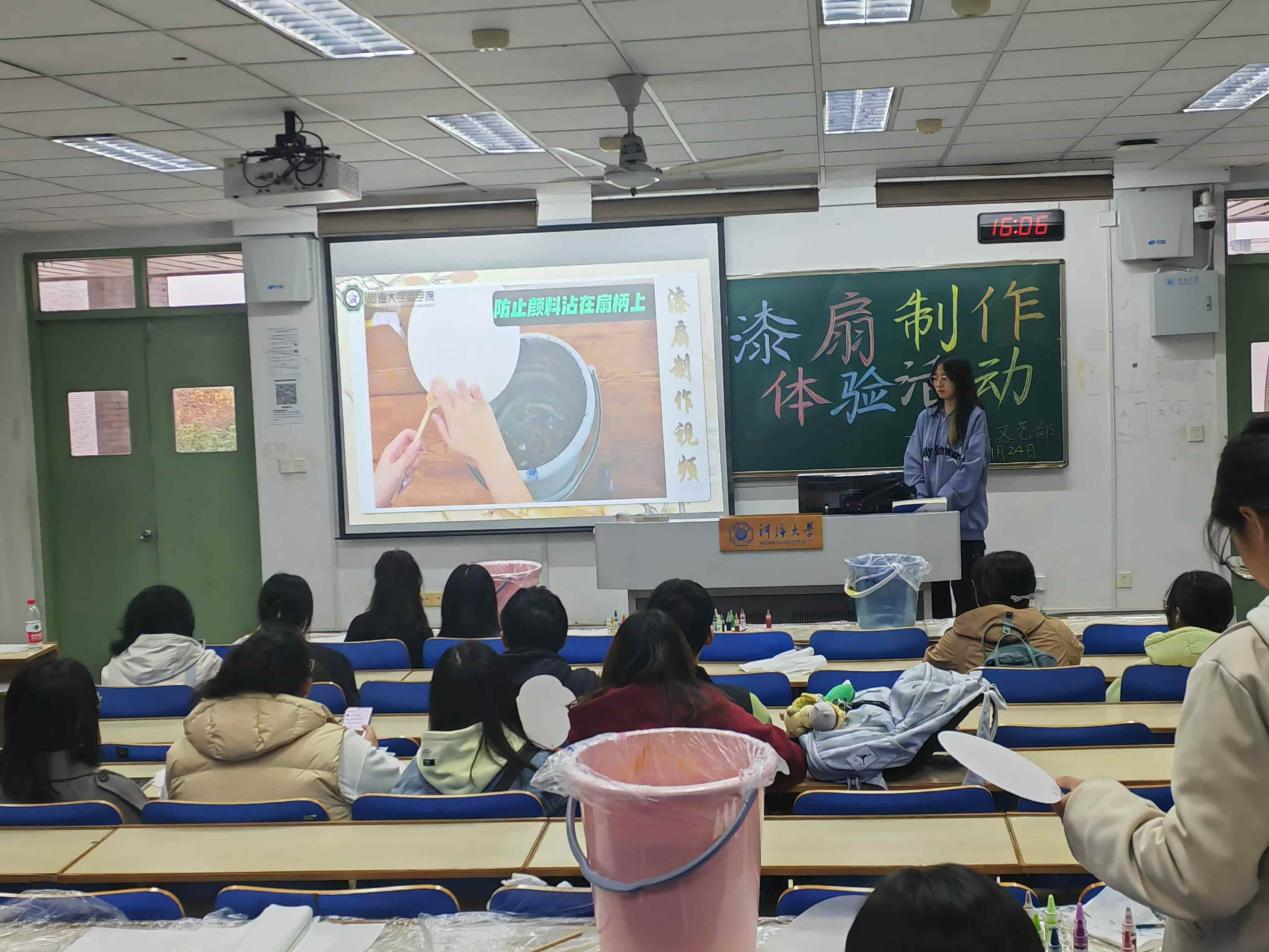 活动当天,主持人详细讲解了漆扇的历史渊源、制作的工艺流程及技巧要点。在看到成品例图时,同学们被扇面上一幅幅独一无二的“水墨画”吸引,全都跃跃欲试,渴望制作出专属于自己独一无二的山河风景图。