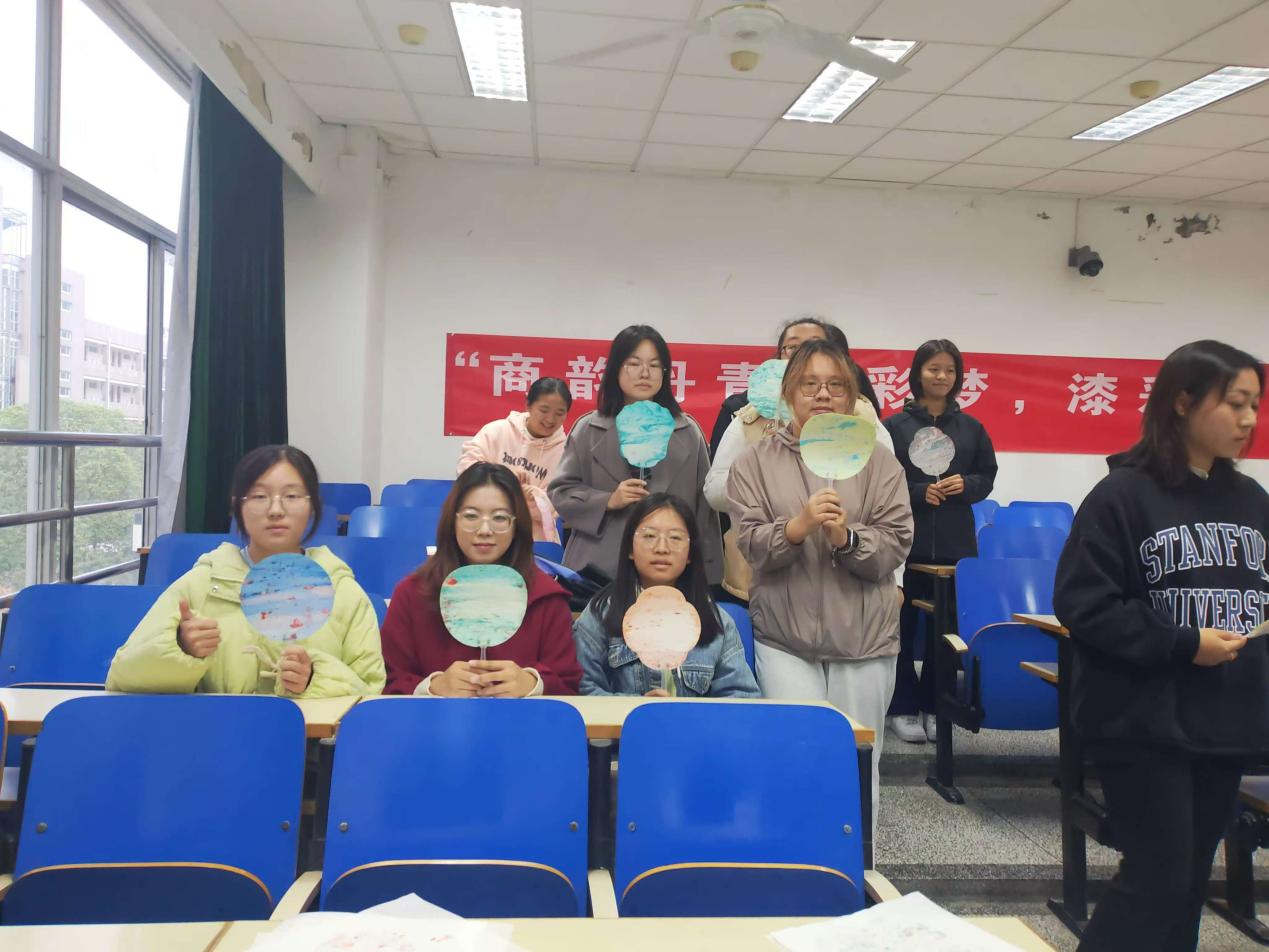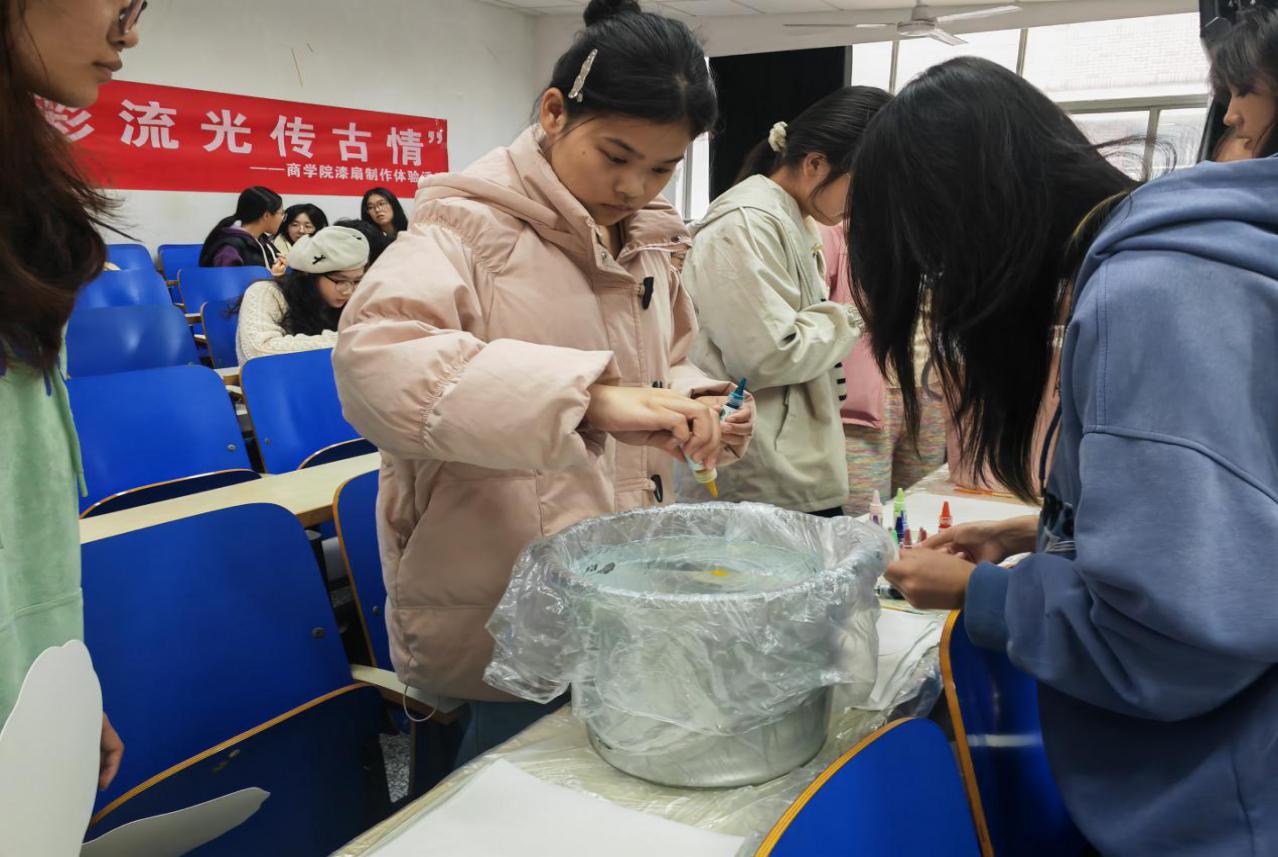 流光定格,摇曳于扇面之上的点点漆色,似山峦似星云似草甸,诗情画意便随着流动的色彩一起跃然纸上。为丰富同学们的精神文化生活,激发同学们对中华优秀传统文化的热爱,a片免费看 学生会文艺部举办以“商韵丹青绘彩梦,漆彩流光传古情”为主题的漆扇制作活动,分别于11月22日和24日在金坛校区2号楼B113和江宁校区致用楼302顺利举行。本次活动为商院学子提供了一个绝佳的体验平台,在创作过程中近距离感受传统工艺的魅力,学习我国优秀的传统文化,为传统技艺的传承注入新的活力。
