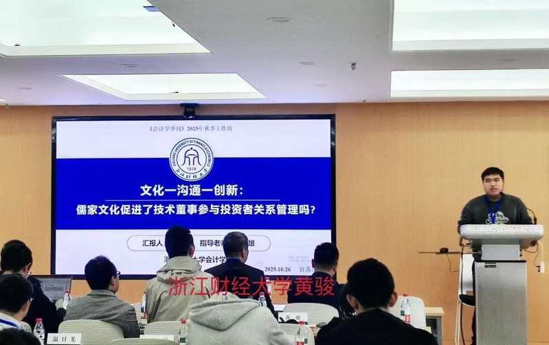 浙江财经大学黄骏作题为“文化—沟通—创新:儒家文化促进了技术董事参与投资者关系管理吗?”的报告。研究指出儒家文化能够显著促进技术董事参与投资者关系管理。