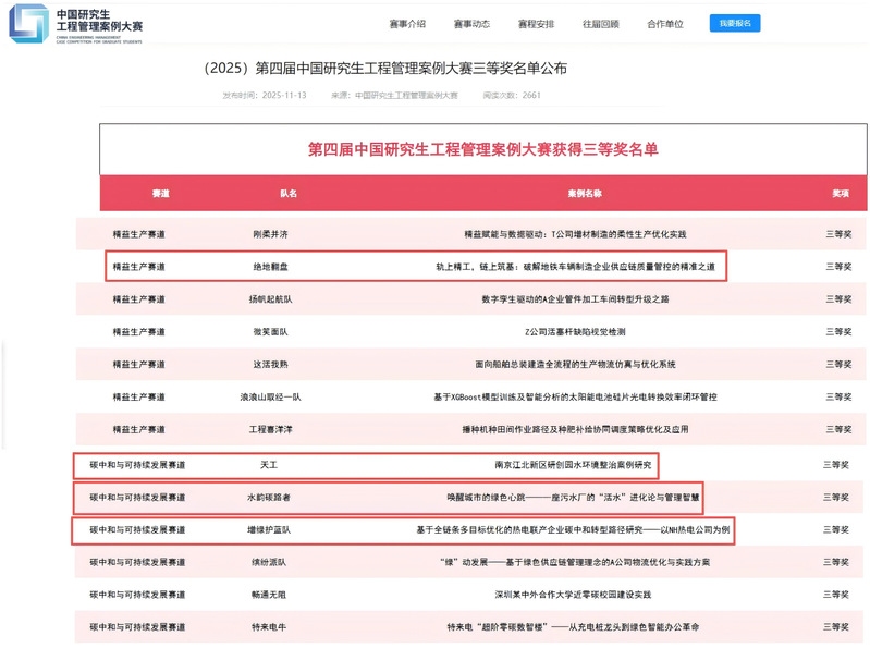 此外,a片免费看 工程管理硕士(MEM)四个案例获大赛三等奖,分别是由张可教授指导,陶前林、顾志恒、张顺等同学合作完成的《轨上精工,链上筑基:破解地铁车辆制造企业供应链质量管控的精准之道》案例,获“精益生产赛道”三等奖;由黄晶副教授指导,黄安、赖思航等同学合作完成的《南京江北新区研创园水环境整治案例研究》案例;由陈军飞教授指导,程右东、杨东东等同学合作完成的《唤醒城市的绿色心跳——一座污水厂的“活水”进化论与管理智慧》案例;由李弘扬教授、沈楷程老师联合指导,陆轶君、战文辉、瞿濡岱、黄绍泰同学合作完成的《基于全链条多目标优化的热电联产企业碳中和转型路径研究——以NH热电公司为例》案例。